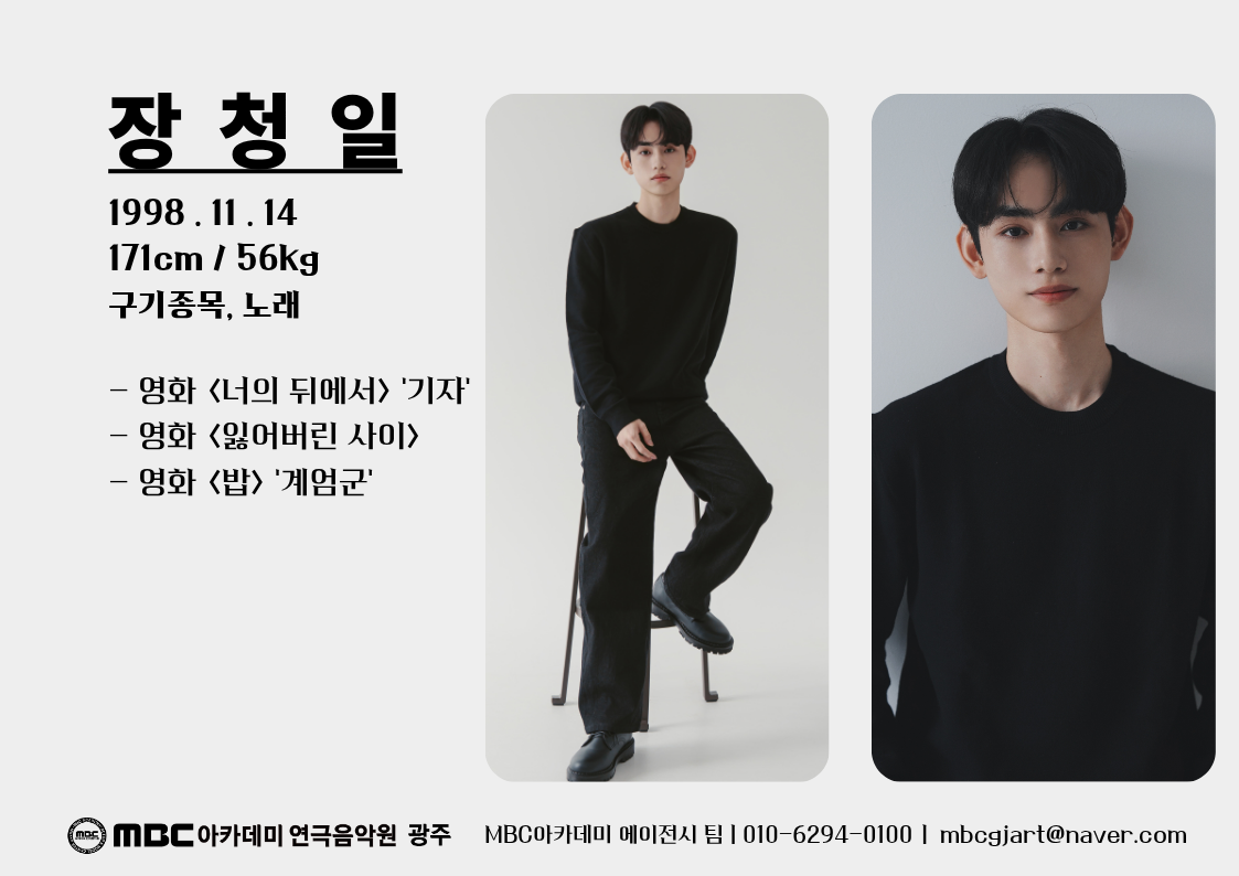 장청일 [남성 · 1998년생] 소속 성인 매체연기반 생년월일 1998-11-14 키 171cm 몸무게 56kg 이메일 mbcgjart@naver.com 담당자 총괄팀장 (010-6294-0100) 필모그래피 Filmography 장청일 - 성인 매체연기반 목록